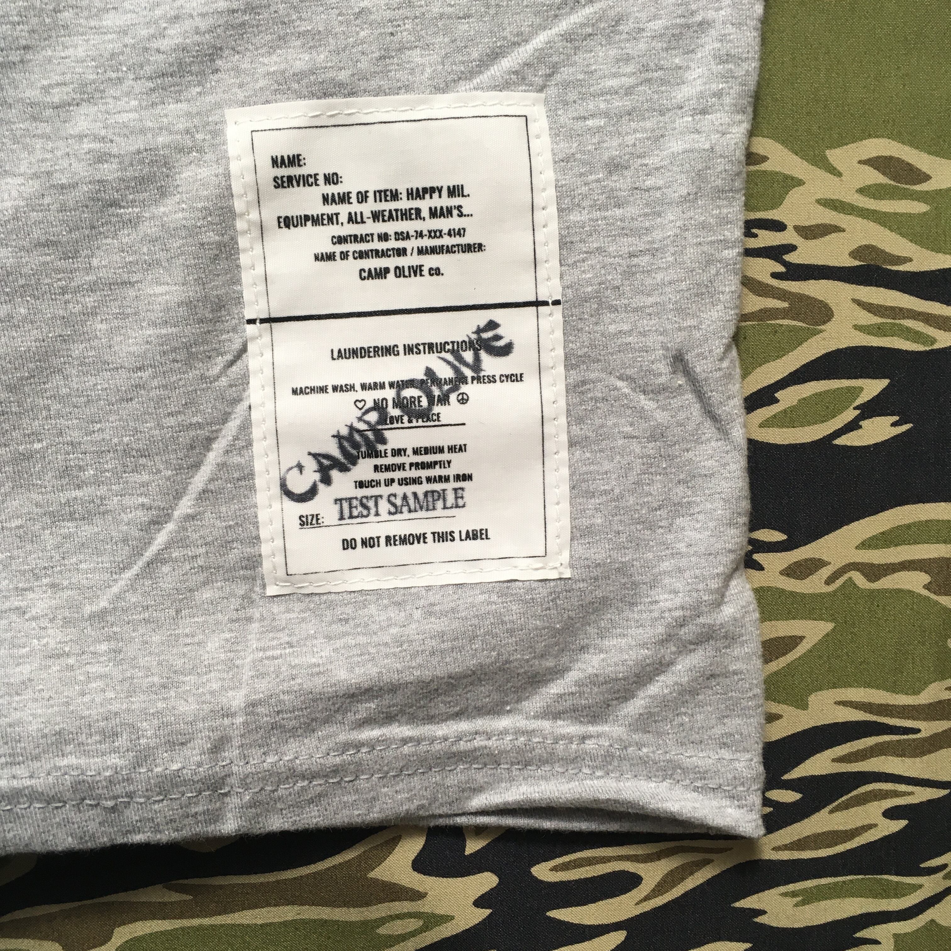 ”平和”のメッセージが込められたMIL.SPECラベルにはCAMP OLIVEのロゴをスタンプして縫い付けています。