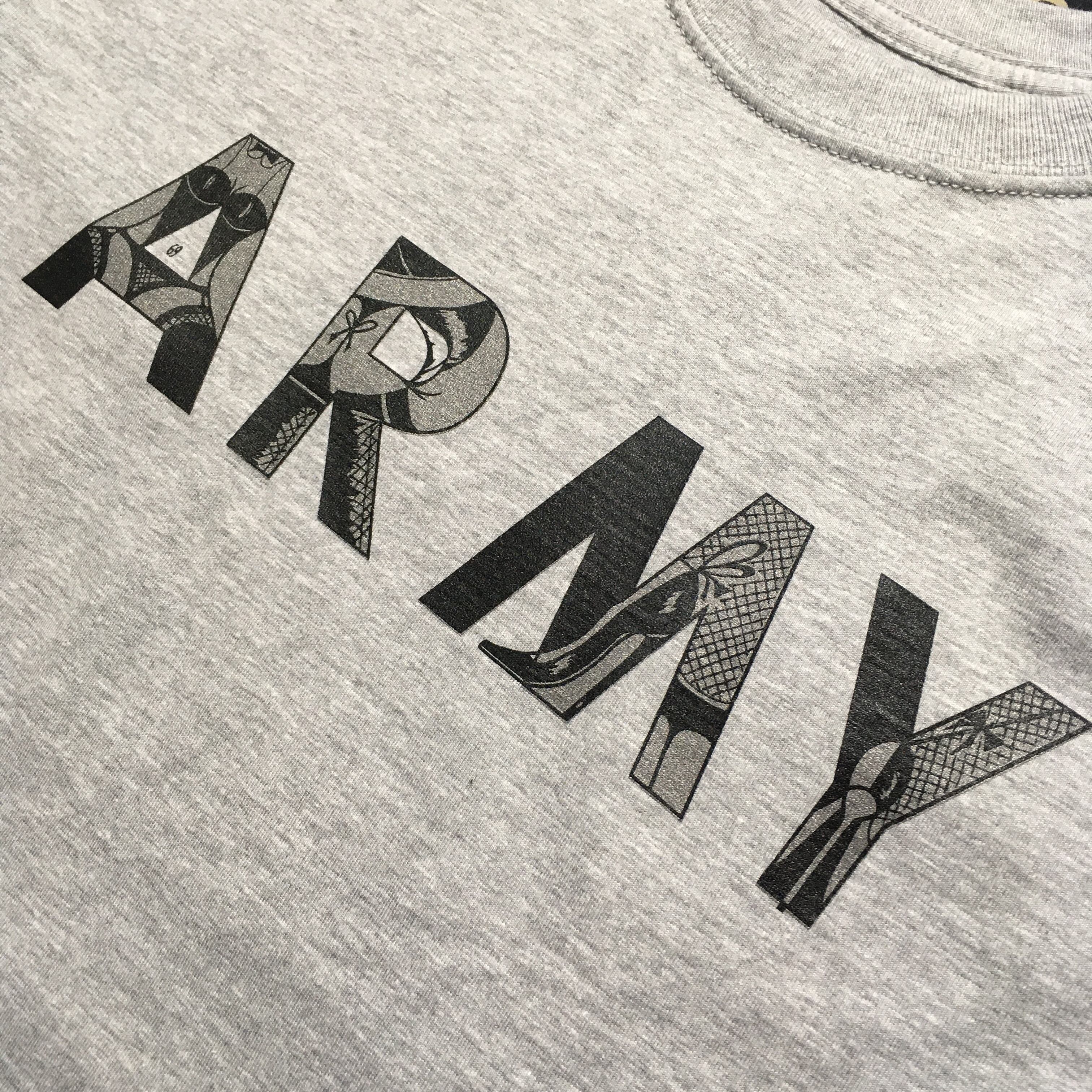 アメリカ陸軍が着用しているトレーニングTシャツを崩したデザイン。